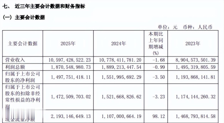 根据公司发布的2025年年报显示,过去一年公司实现营业收入约为105.97亿元,同比减少1.68%;归属于上市公司股东的净利润为14.98亿元,同比减少3.5%。